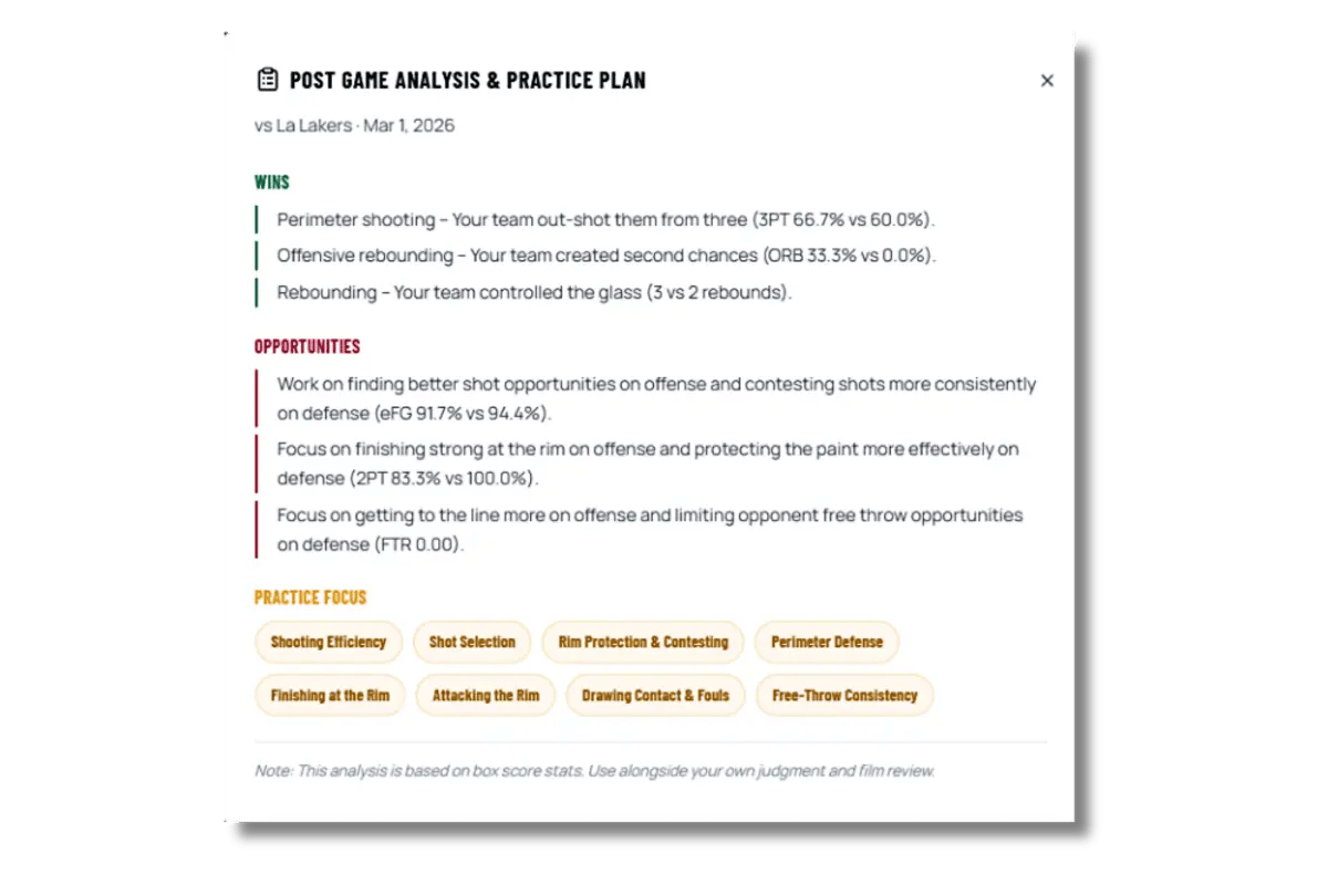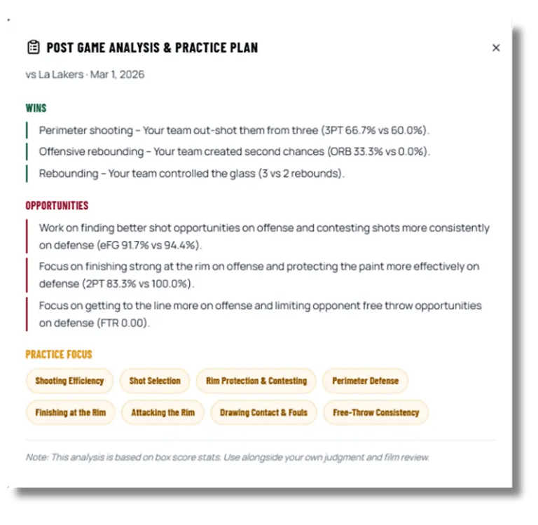 Basketball stats tracking app on mobile showing live game score and stat buttons for coaches